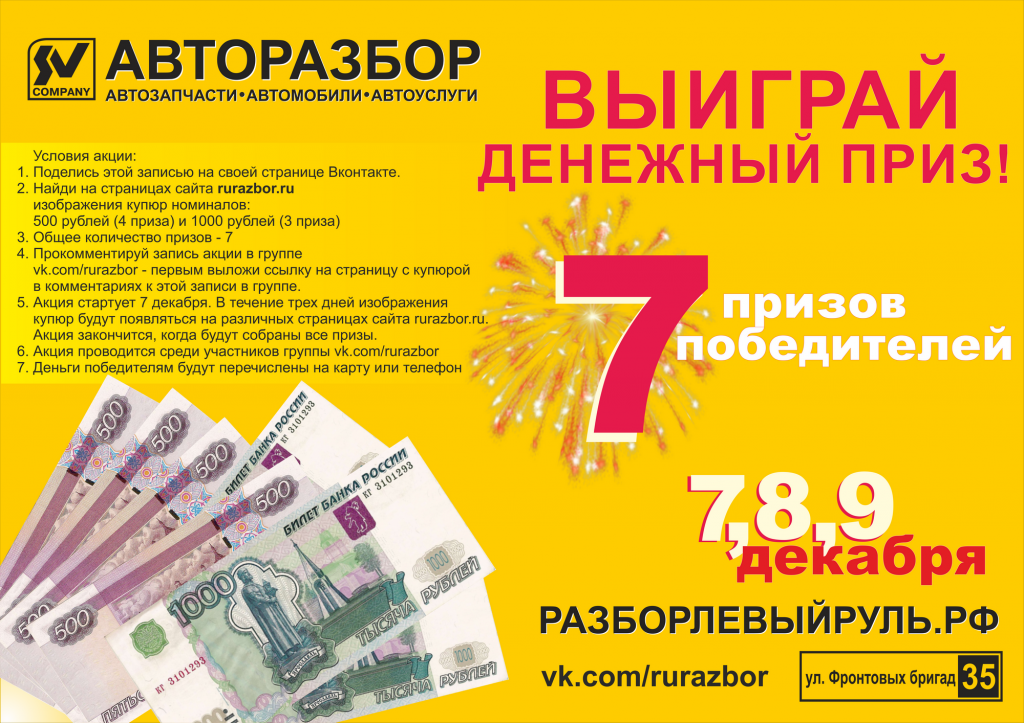 - Количество призов - 7. Четыре купюры номиналом в 500 рублей и 3 купюры номиналом 1000 рублей.